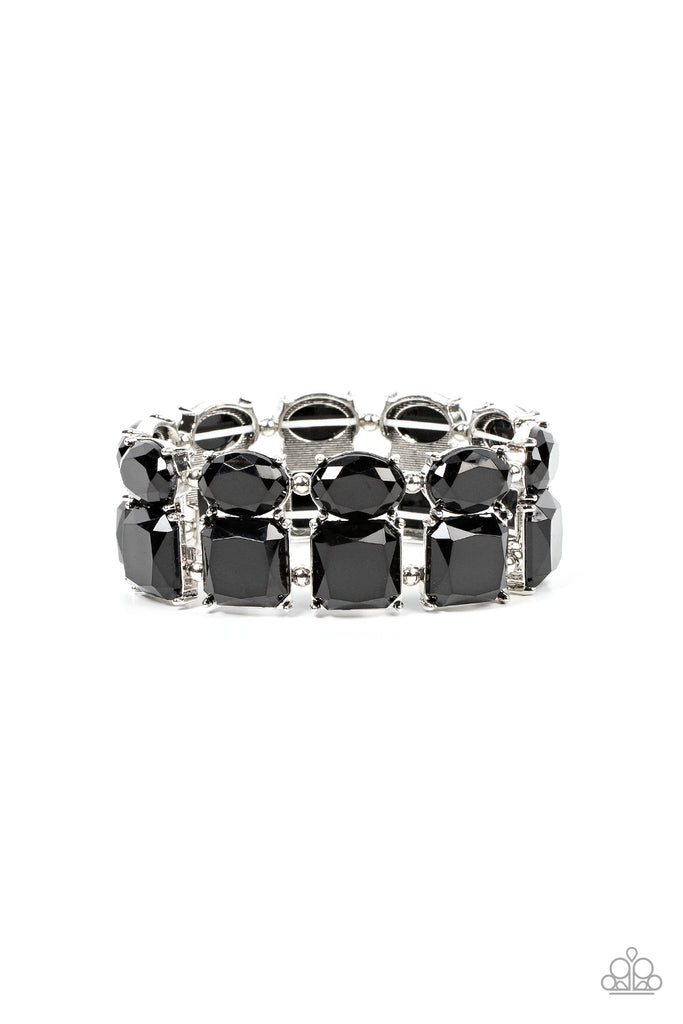 Separated by pairs of dainty silver beads, faceted stacks of oval and square cut black beads are threaded along a stretchy band around the wrist for a bold pop of color.