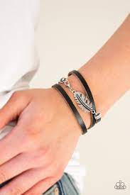 Infused with a shimmery silver feather charm, an elongated strip of black leather triple wraps around the wrist for a wanderlust flair. Features a clasp closure ...