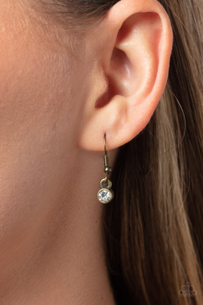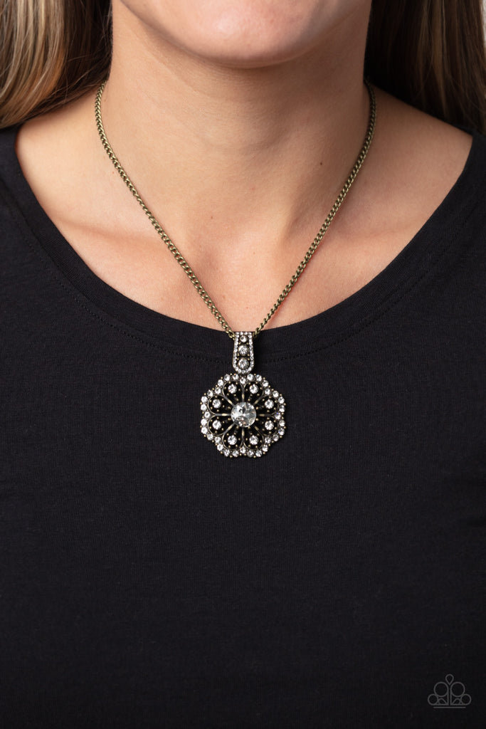 Sliding along a brass chain, a rhinestone-encrusted bail clasp displays a white, rhinestone-encrusted floral pendant. Blooming from a white gem center, airy brass petals dusted by a border of dainty rhinestones and dotted with white gems shine against the chest in a brilliant finish. Features an adjustable clasp closure.