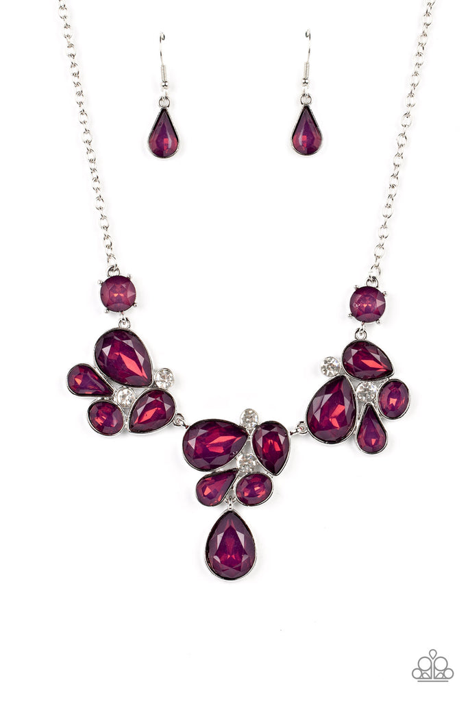 Draped elegantly across the chest, clusters of geometric blue gems, brushed in a plum tint, gather around sparkling white rhinestones, creating a bright and beautiful pattern. Features an adjustable clasp closure.