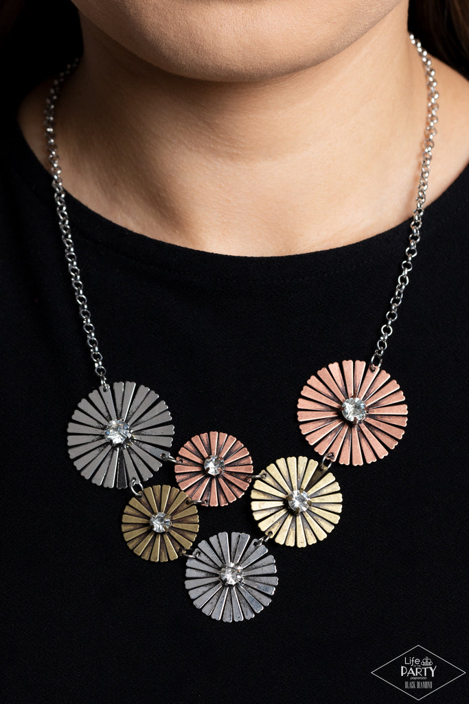 Dotted with white rhinestone centers, an antiqued collection of ribbed brass, copper, and silver floral frames fan out below the collar for a flawless look. Features an adjustable clasp closure.