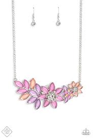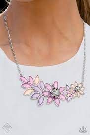 An explosion of glassy, marquise-cut petals, in shades of orchid, Peach Pink, and lavender, fan out below the collar to create a flowery statement piece.