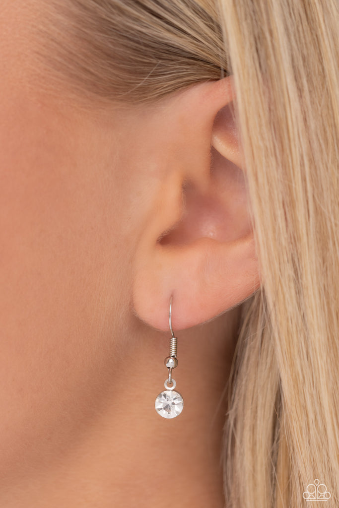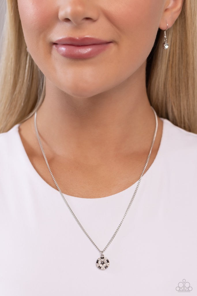 Gliding along an elongated dainty silver chain, a white rhinestone-embossed soccer ball with black-painted hexagons stands out for a sport-inspired pendant. Features an adjustable clasp closure.