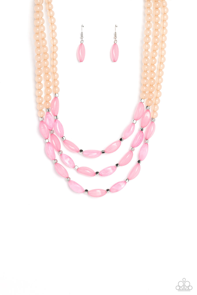 Shiny silver cubed accents, cloudy, milky, pink oval beads and milky peach beads coalesce down the neckline on invisible wires, creating a trio of colorful layers. Features an adjustable clasp closure.
