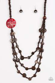 Featuring a whimsical floral pattern, a dramatic red wooden bead adorns one side for a seasonal finish. Sold as one individual necklace.