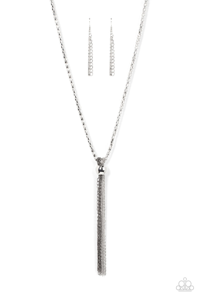 A metallic mashup of silver and gunmetal chains stream out from an oversized silver beaded fitting at the bottom of a chunky silver mesh chain, creating a tantalizing tassel down the chest. Features an adjustable clasp closure.