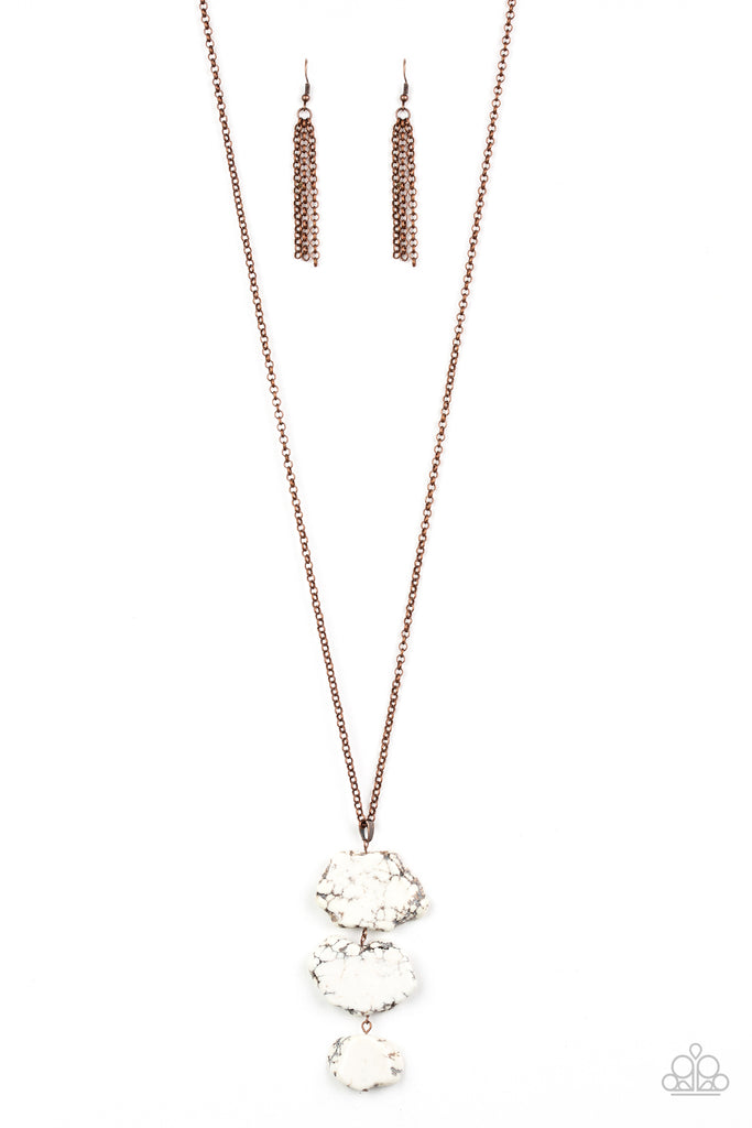 As if chipped off a cliff, pieces of white rock link at the bottom of a lengthened copper chain for an earthy look. As the stone elements in this piece are natural, some color variation is normal. Features an adjustable clasp closure.