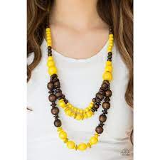 Brushed in sunny yellow and earthy brown finishes, vivacious wooden beads and discs are threaded along strands of shiny brown cording for a summery look.