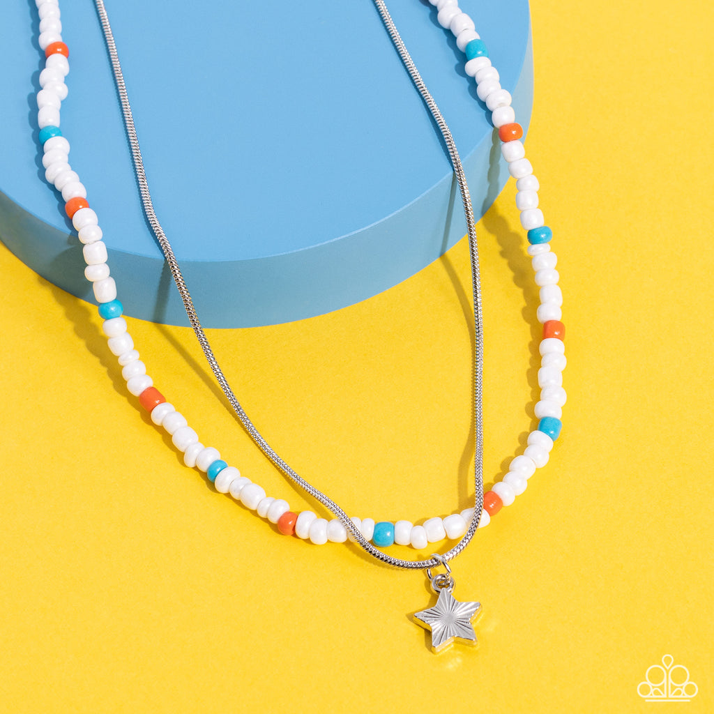 Multicolored seed beads in shades of white, blue, and orange are threaded along a wire, falling along the collar in a capricious pattern. A delicate silver snake chain, features a twinkling silver star etched with linear textures, as it layers together with the colorful beads for a sassy and starry, combo. Features an adjustable clasp closure.