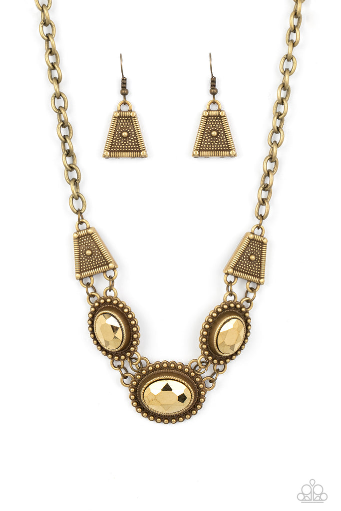 Classic oval-shaped rhinestones in a vibrant aurum hue sit prominently atop brass frames bordered in studded texture. Trapezoidal shaped frames filled with dizzying brass texture lay on each side of the colorful gems, as they fall along the collar in a breathtaking finish. Features an adjustable clasp closure.