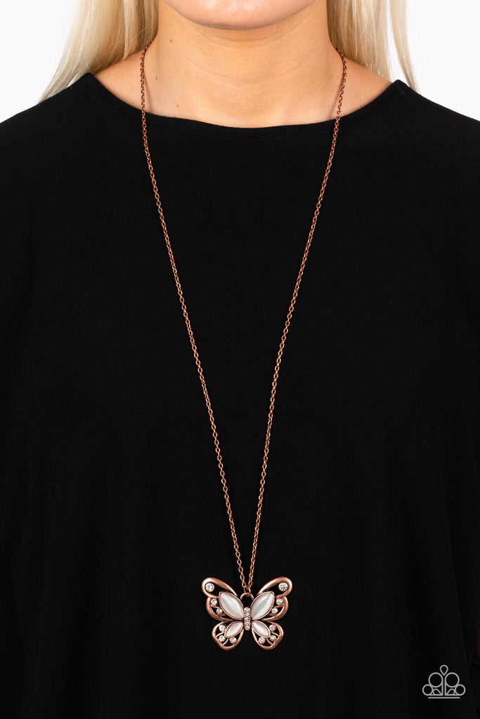 Swirls of copper filigree curl into the shape of a butterfly, creating a whimsical pendant that swings from the bottom of a long copper chain. Glassy white cat's eye stones layer atop the copper filigree, adding three-dimensional detail and a refined shimmer, while classic white rhinestones line the center of the design and dot the wings. Features an adjustable clasp closure.