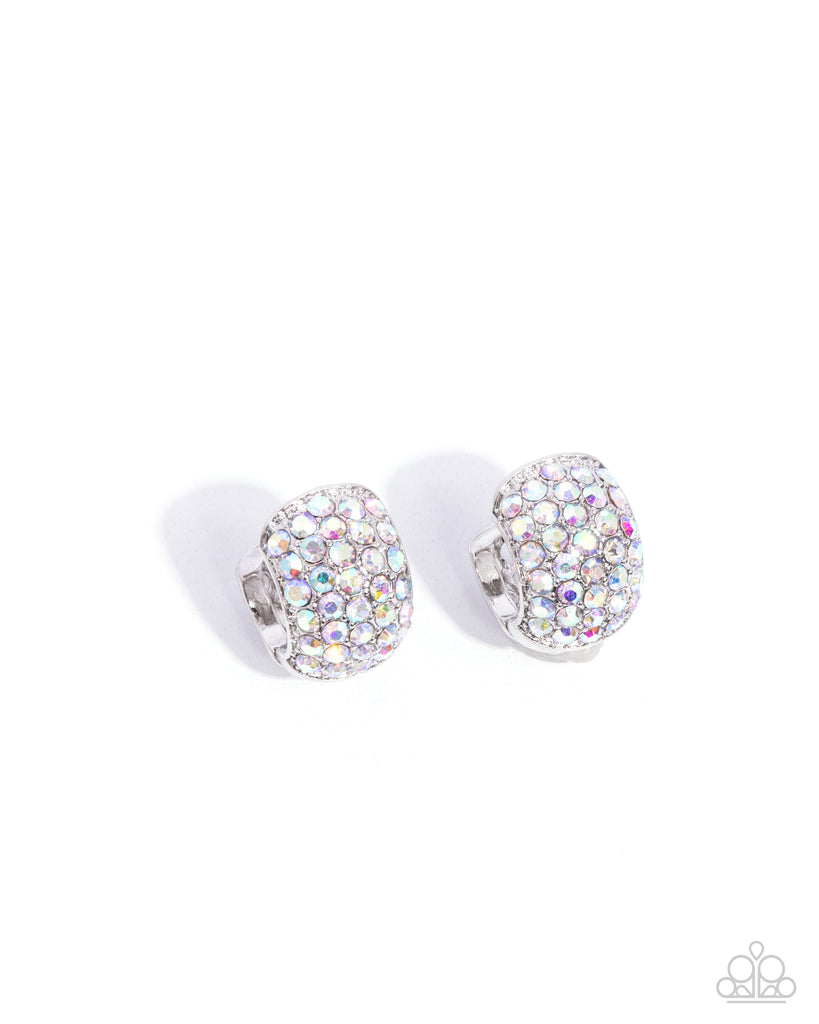 Embellished in row after row of iridescent rhinestones, a thick silver hoop hugs along the ear for an upscale, unique look. Earring attaches to a standard hinge closure fitting. Hoop measures approximately 3/4" in diameter. Due to its prismatic palette, color may vary.