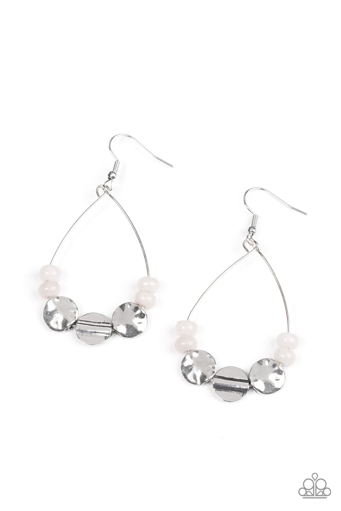 An earthy collection of rounded white stones and hammered silver discs are threaded along a dainty wire, resulting in an artisan inspired teardrop. Earring attaches to a standard fishhook fitting.